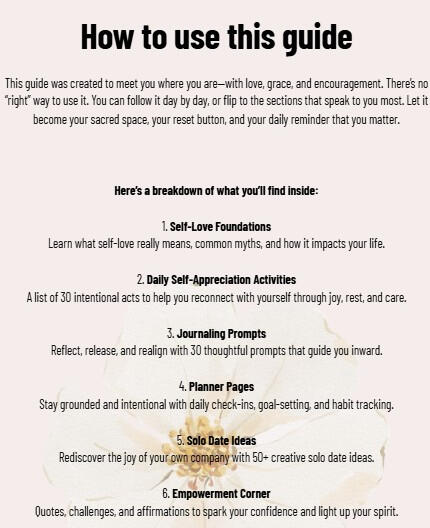 • 30-days of daily self-appreciation activities, weekly planners, mood trackers & habit logs• 50+ solo date ideas to help you fall in love with your own company.• 30 guided journaling prompts with affirmations.• Empowerment quotes, challenges & more.Created with love to help women reconnect with their power. This is your space to heal, grow, and fully love YOU.* For secure processing, you will be redirected to our official checkout page on Stan Store to complete your payment.